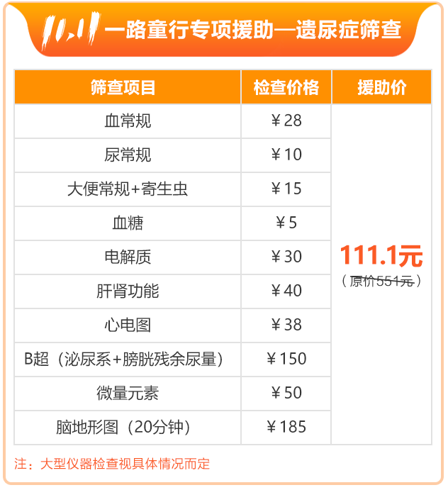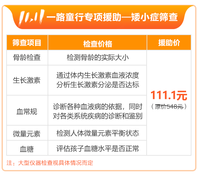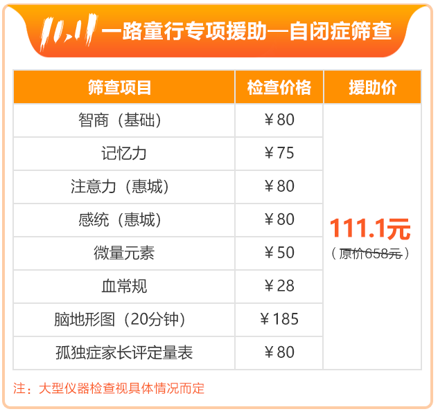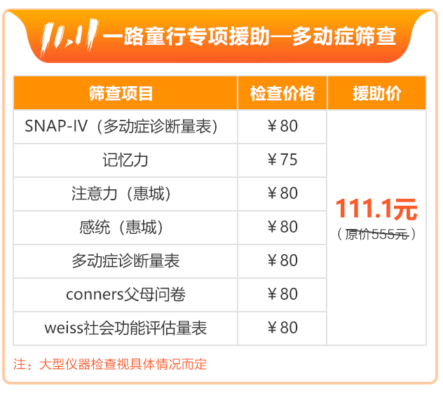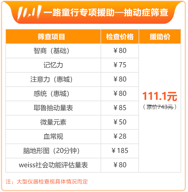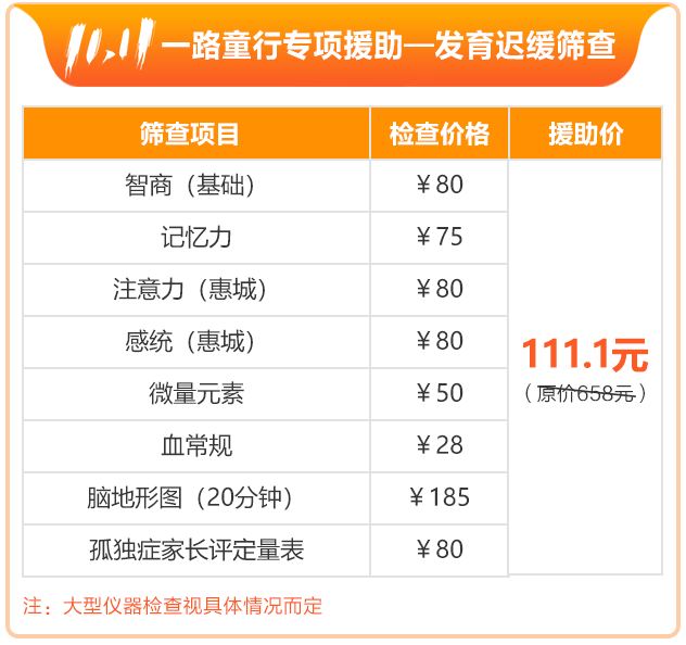 双十一当天,由四川省关心下一代基金会提供专项筛查援助,六大类数十项检查享受双十一专属援助价:111.1元,家长需提前申请购买。