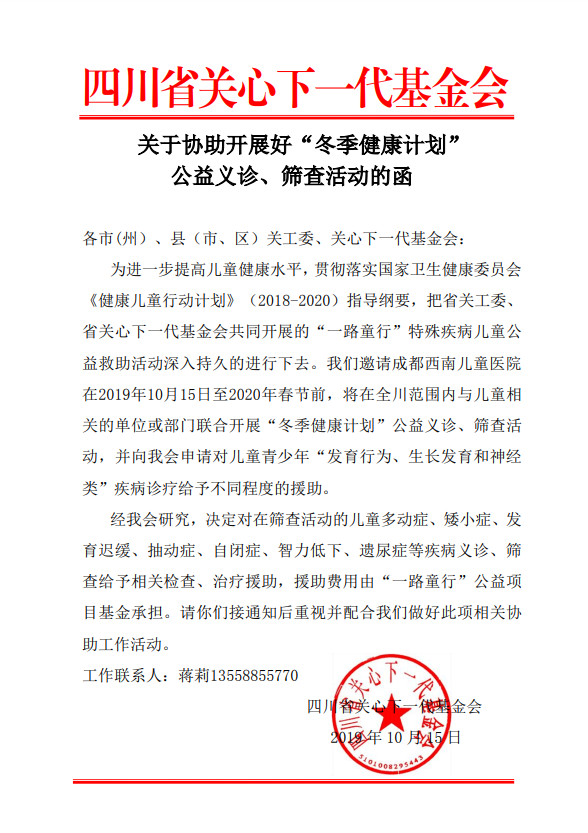 然而众多家长往往只关注孩子的学习、生活以及身体体表的健康,对于孩子的尿床、矮小、心理问题等不够重视。为了让更多家长了解、关心、关注儿童身心健康,帮助孩子健康成长。在四川省关心下一代基金会“冬季健康计划”和“一路童行”儿童公益项目的政策支持下,特邀三甲儿科专家亲临会诊。